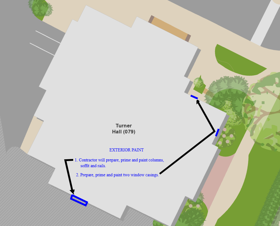 A contractor will scrape, prime, and paint all of the doors, windows, and handrails around the building's exterior. |